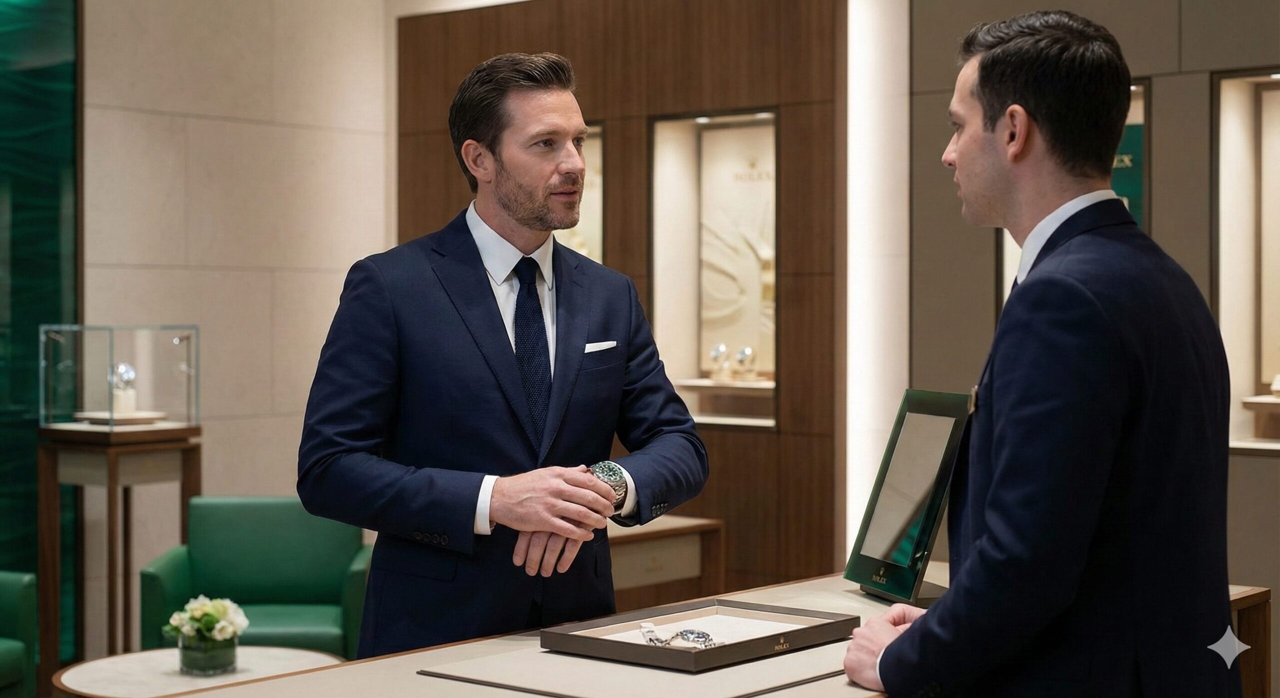 店員さんは非常に丁寧に、しかしどこか含みのある笑顔で話し始めました。「本日は特別な日になりそうですね。お探しなのは、ステンレスのデイトナで間違いありませんか?」